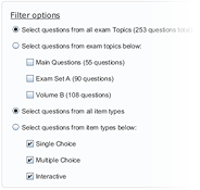 Put an end to answering and re-answering question you have a firm grasp of - fiolter your delivered questions by topic, exam sets, or even by question type! Choose to only answer questions with single answers, multiple choice, or interactive answer such as drag an drop.